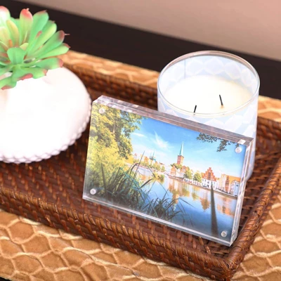 - ACRYLIC PICTURE FRAME: These acrylic block picture frames are strong enough to hold pictures flat and securely; whether displayed horizontally or vertically, photos will not slide out of place