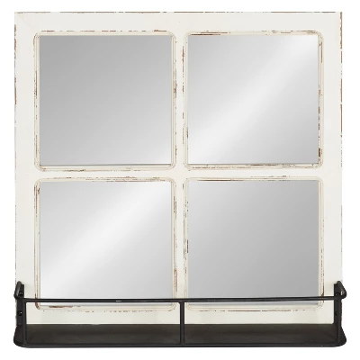 This framed mirror combines rustic farmhouse design with functionality for your home. Hang this mirror in your entryway for one last look out the door and to hold your keys, hooks, mail, or anything you need to remember as you leave the house. You can also hang this mirror in a bathroom or bedroom to create the illusion of space with the four mirrored windowpanes. This framed mirror is constructed of wood with a distressed finish and has a 20 inch wide by 4 inch deep black metal shelf. This mirror arrives completely assembled and ready for use. Two metal d-ring hangers are attached to the back of the frame for easy and secure wall display. The outer dimensions measure approximately 20 inches across and 20 inches high with a depth of 5 inches from the wall. Each mirror pane is 8 inches square. This multi-functional wall hanging wall mirror is the perfect tool to organize to your home, kitchen, or entryway in rustic country design.