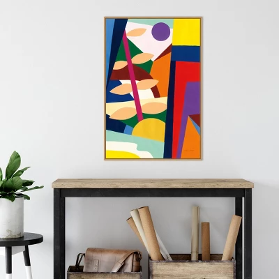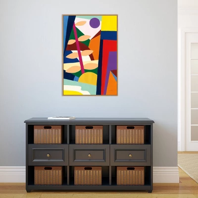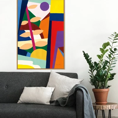 ART DESCRIPTION: This portrait-oriented painting features several distinct geometric shapes of different colors superimposed over each other, almost as if they are cutouts from various scenes of construction paper. The overall vibe is modern with colors ranging from bold to pastel. This Amanti Art canvas art print was created by Megan Gallagher and printed by Amanti Art in Madison WI. The canvas is stretched by hand and finished with a float frame. Individually made using traditional custom framing techniques, it has the quality you would expect from your local frame shop. Because of our attention to detail and focus on artistry, architects, interior designers, and homeowners alike choose this framed canvas artwork to create beautiful living spaces.