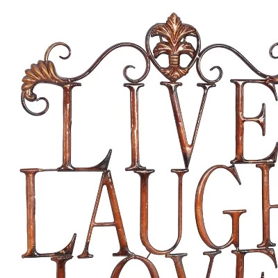 Place this on any blank wall space adding both texture and depth to your home. This live laugh love wall decor provides your traditional style inspired living space with a nice mantra adding a calming boost. This item ships in 1 carton. Iron wall decor makes a great gift for any occasion. Can be hung horizontally using the sawtooths on the back; nails and screws not included. Suitable for indoor use only. This is a single brown colored wall sculptures. Traditional style. LIVE LAUGH LOVE metal motivational wall art.