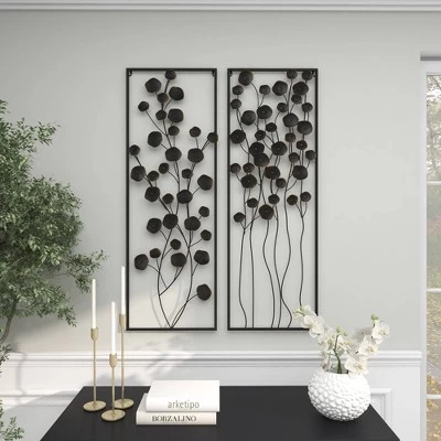 Hang this flower wall decor set as a pair on one wall, or use separately to add dimension to your hallways. This item ships in 1 carton. Placed in black metal frames in order to form an exceptional 3D wall decoration. Can be hung vertically using the keyholes on the back; nails and screws not included. Suitable for indoor use only. This item ships fully assembled in one piece. This black colored wall sculptures comes as a set of 2. Farmhouse style.
