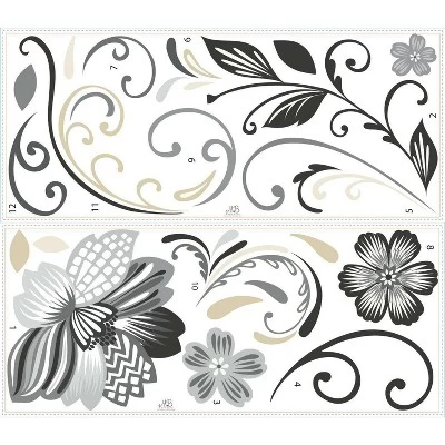Create a space with elegance and class with these Black and White Flower Scroll peel and stick wall decals. Designed with gold, gray and black art, these wall decals complement any color furniture. Easy to apply, remove and reposition as much as necessary without damaging the wall decal. Hang in a living room, bedroom, bathroom and more!