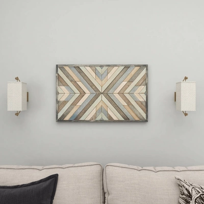 - •This multicolor rectangular wooden wall plaque features a distressed finish and a crisscross chevron pattern